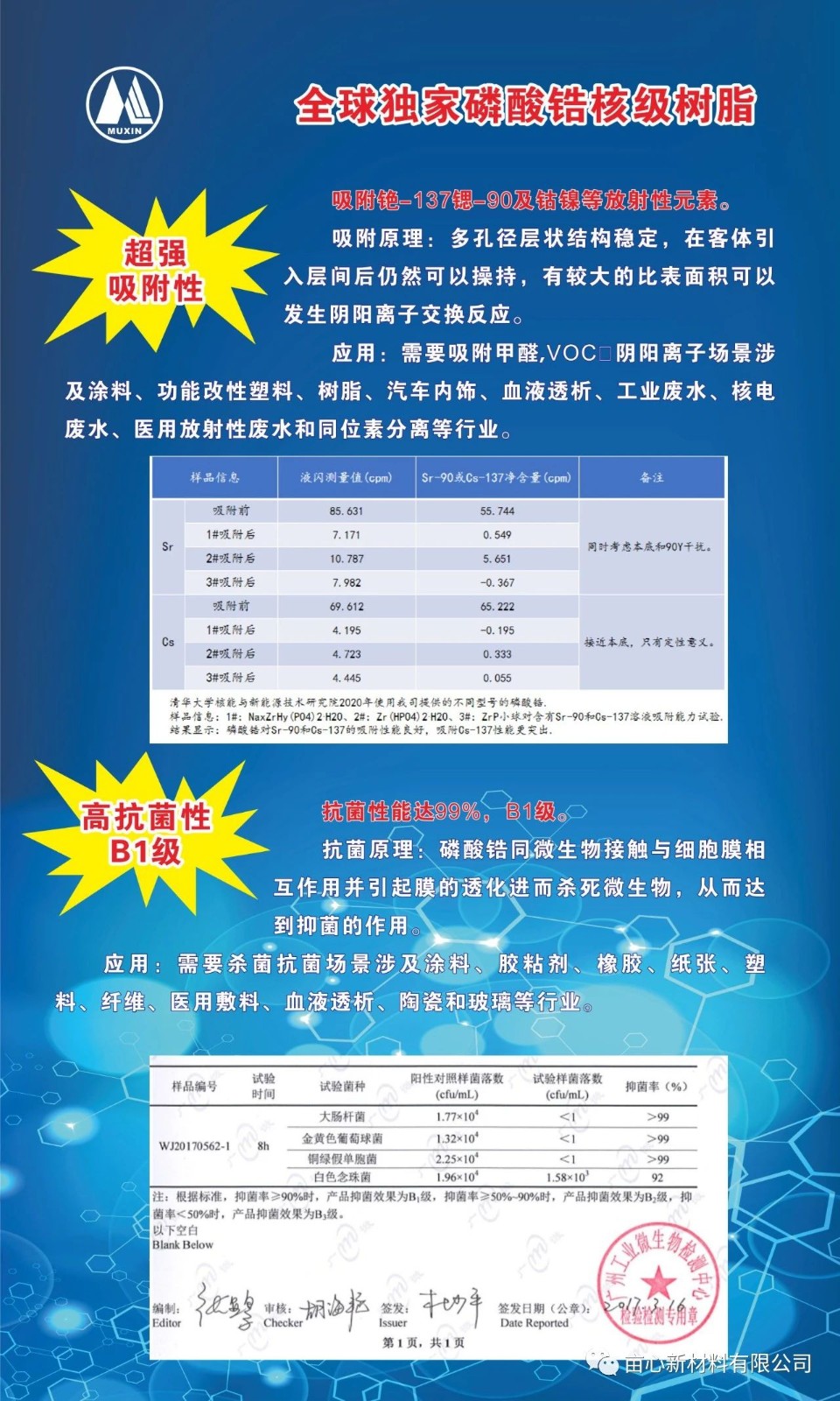四川畝心新材料有限公司(英文名:“Resin&Zircon Technology Co., Ltd.”)是全球獨(dú)家生產(chǎn)磷酸鋯系列功能樹脂的高新技術(shù)企業(yè),我們提供磷酸鋯核級樹脂、通用樹脂、醫(yī)療放射性廢水一站式處理解決方案。